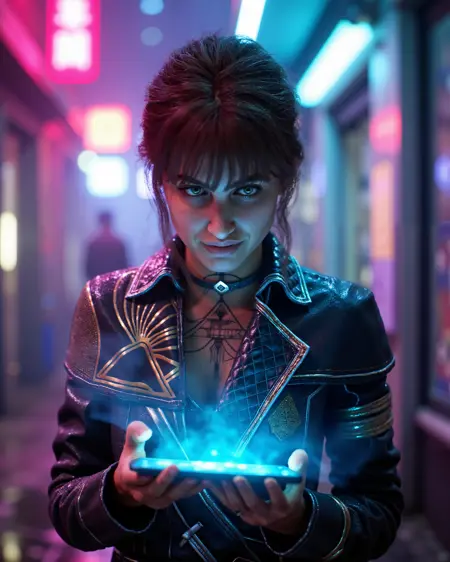 Prompt: sc137.The image is a high-quality Photo‑realistic mid‑body portrait photo, showcasing a woman. She has light brown hair, styled in a messy, windswept manner, with bangs framing her face. Her piercing green eyes are wide open,