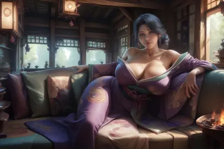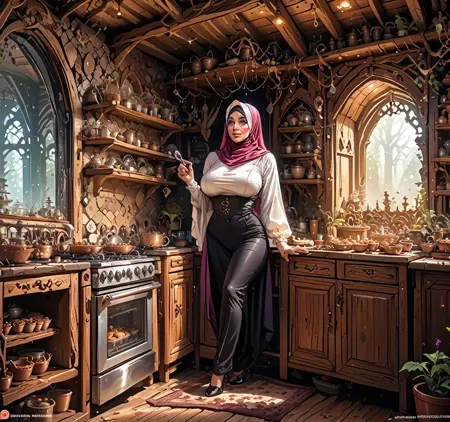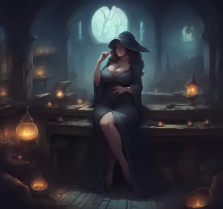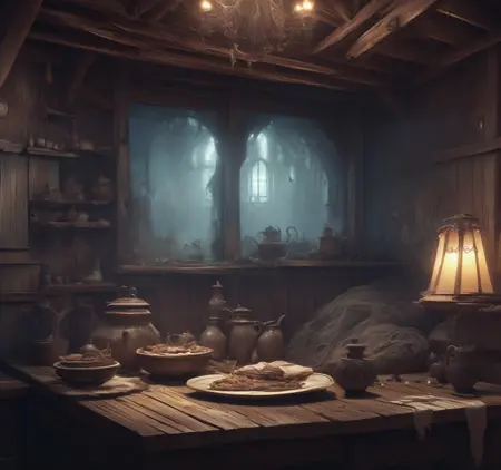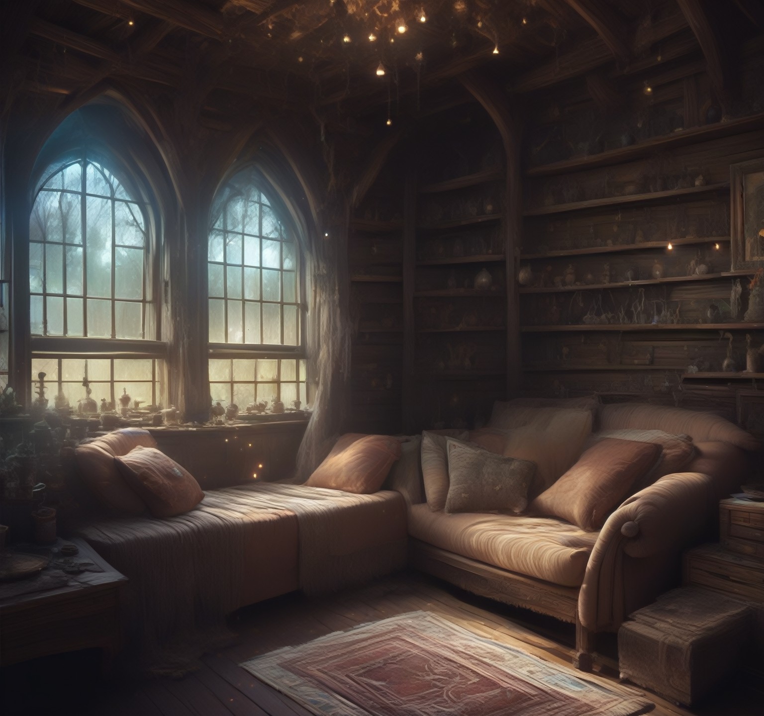 Trigger is w1tchhut with interior descriptive words like indoors, scenery, clutter, furniture, bed, couch, fireplace, chair, armchair, vial, food, vine, table, rug, wooden floor, wooden wall, stone wall, night, moonlight, stairs, etc. being useful.