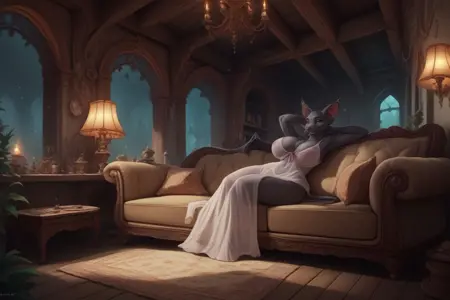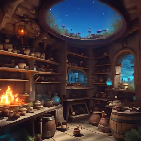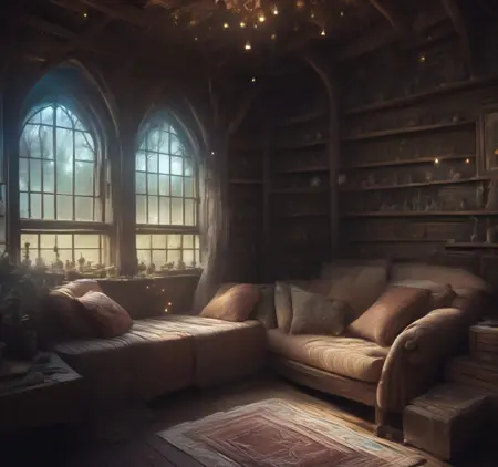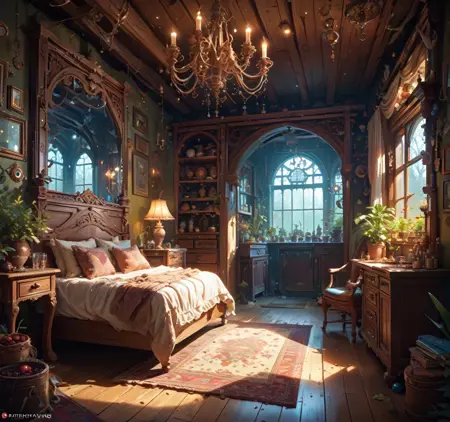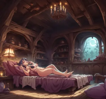 트리거는 _w1tchhut_이며, indoors, scenery, clutter, furniture, bed, couch, fireplace, chair, armchair, vial, food, vine, table, rug, wooden floor, wooden wall, stone wall, night, moonlight, stairs 등의 내부 묘사어가 유용합니다.