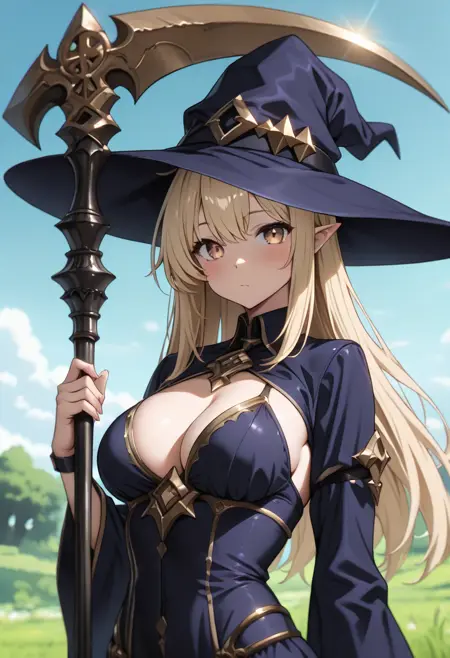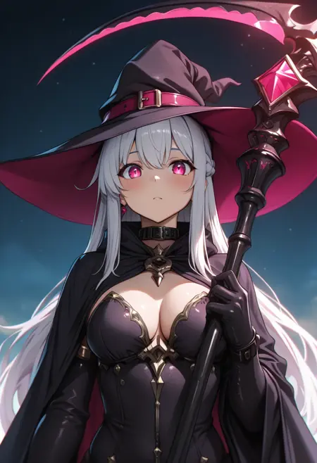 "HDR, 8k, 高コントラスト, 名作, 最高品質, 信じられないほど美しい品質, 非常に美的, 高解像度, 超詳細, absurdres, 最新, 風景, (1girl, 上半身, 女王, 魔法の衣装と魔法の帽子を着用、視線を向ける、彼女は(巨大な輝く鎌を振るっている:1.25):1.2)"