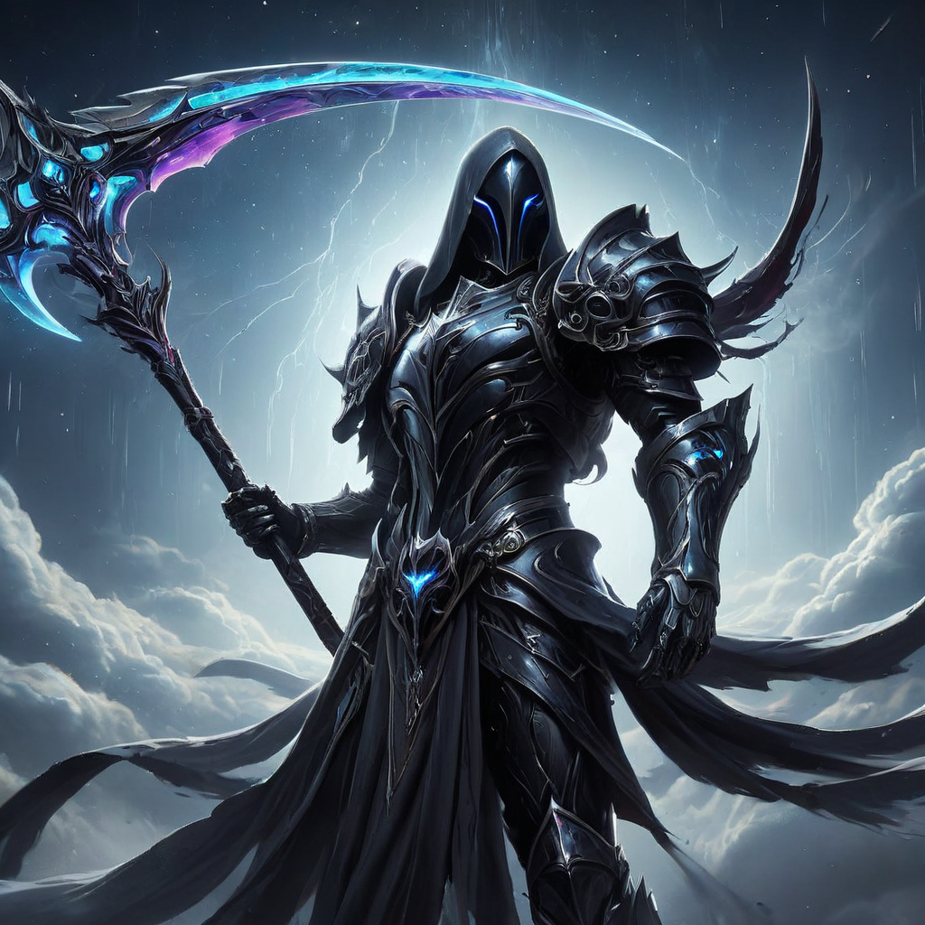 "단독 로봇의 풀바디 샷, 검은 로브와 후드 착용, 빨간 빛나는 눈, 낫 무기를 손잡이로 잡고, 배경에 미래주의 사이버펑크 도시, HD, 명작, 최고 품질, 초세밀, 초상세_"_제가 추천하는 VAE는 공식 sdxl_vae입니다.