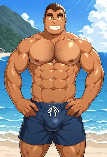 - 由于他是成人游戏的主角,我曾想过让他长成一个平平无奇、毫无特色的普通外貌,但那样画起来自己会觉得没意思,所以干脆按自己心中最具普遍性的形象(大概会受大众欢迎的类型)来设计。毕竟游戏(或者说剧本创作者)明显倾向于让他经历大量激烈的情节,因此我给他设计了肌肉发达、体魄强健的外形。考虑到与其他无体毛角色的互动,我曾尝试为他添加一些淡淡的胸毛作为可选特征,但好几次都忘了画……由于他性格热血(=单纯莽撞),表情变化丰富,从这个角度看是个很好画的角色(情绪容易表现)。他的特征是刺猬头和胡茬。开头和结尾处头部造型有变化是默认设定,无需在意。结局我尝试了几种不同的发型,你觉得如何?(希望不要看起来像换了个人)