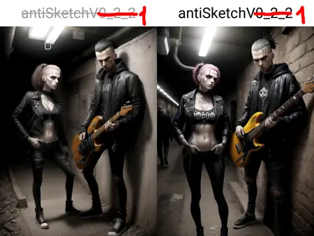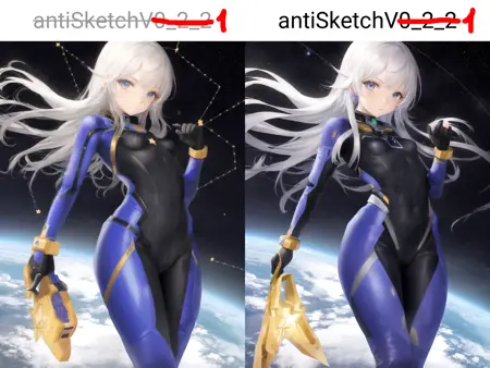 Just like antiBlur pushes image away from not completed and low detailed artwork that got into training data of the SD. Impacts shading, small details, background quality and fingers count. Preview images were not post-processed (e.g. img2img or inpaint).