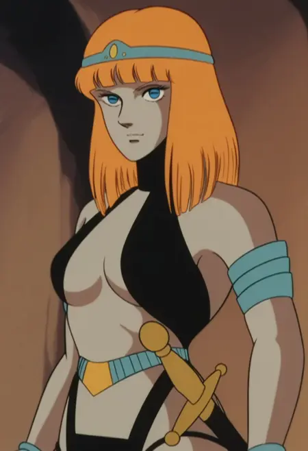 shmnmzg3r, 푸른 눈, 가로 동공, 검은 레오타드, 옷 자르기, 원형 머리장식, 하얼터넥, 팔찌, 팔찌, 벨트, 하이힐 부츠, 무릎 부츠, 레트로 아트스타일, 애니메이션 스크린캡,