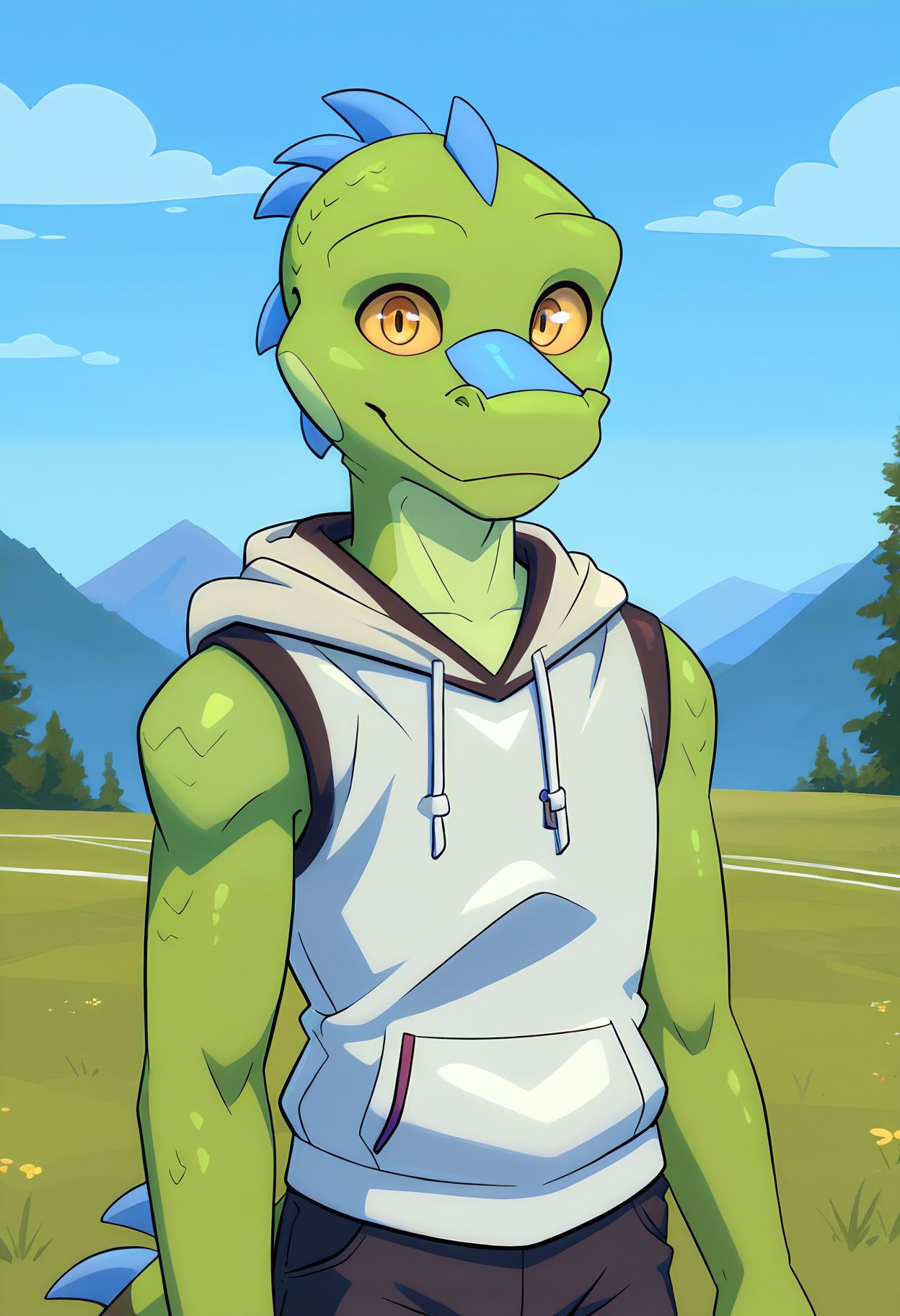 Basic prompt: rick_(savestate), 1boy, scalie, reptile, green skin, green scales, yellow eyes, yellow sclera, grey hoodie, sleeveless, black shorts, source_furry