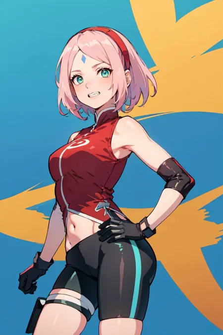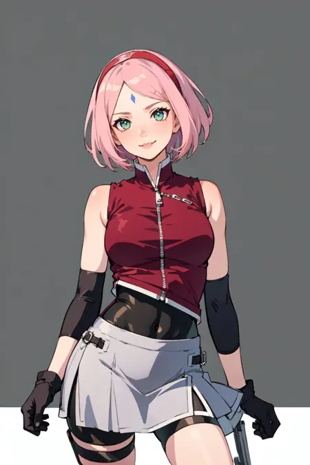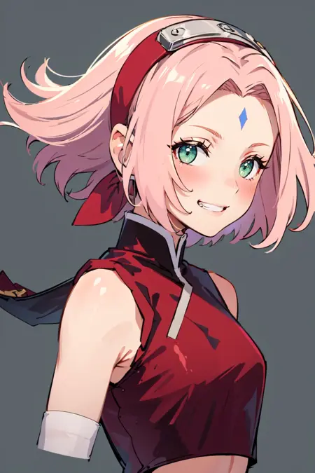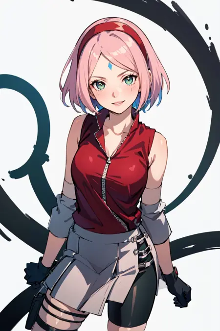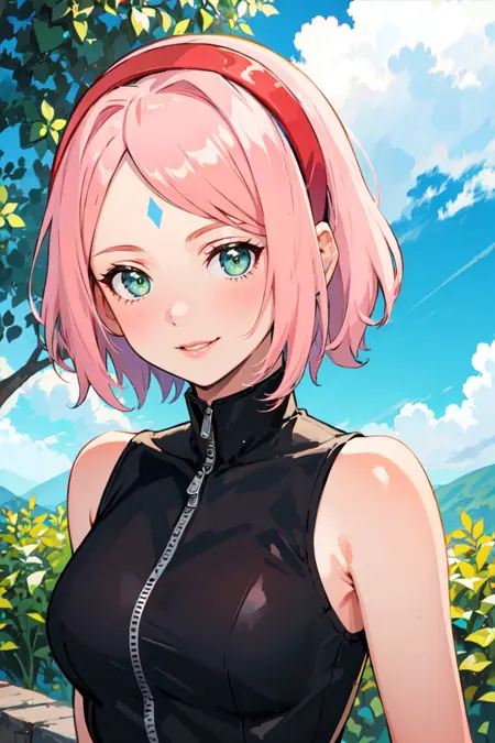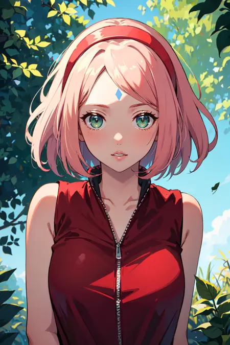 彼女の_オリジナルの衣装_を使う場合は、以下のタグを使用してください:pikkysakura, 1girl, solo, looking at viewer, pink hair, short hair, bangs, parted bangs, green eyes, breasts, medium breasts, forehead protector, hairband, headband, forehead mark, facial mark, red hairband, sleeveless, zipper, sleeveless jacket, red jacket, sleeveless shirt, red shirt, shirt, jacket