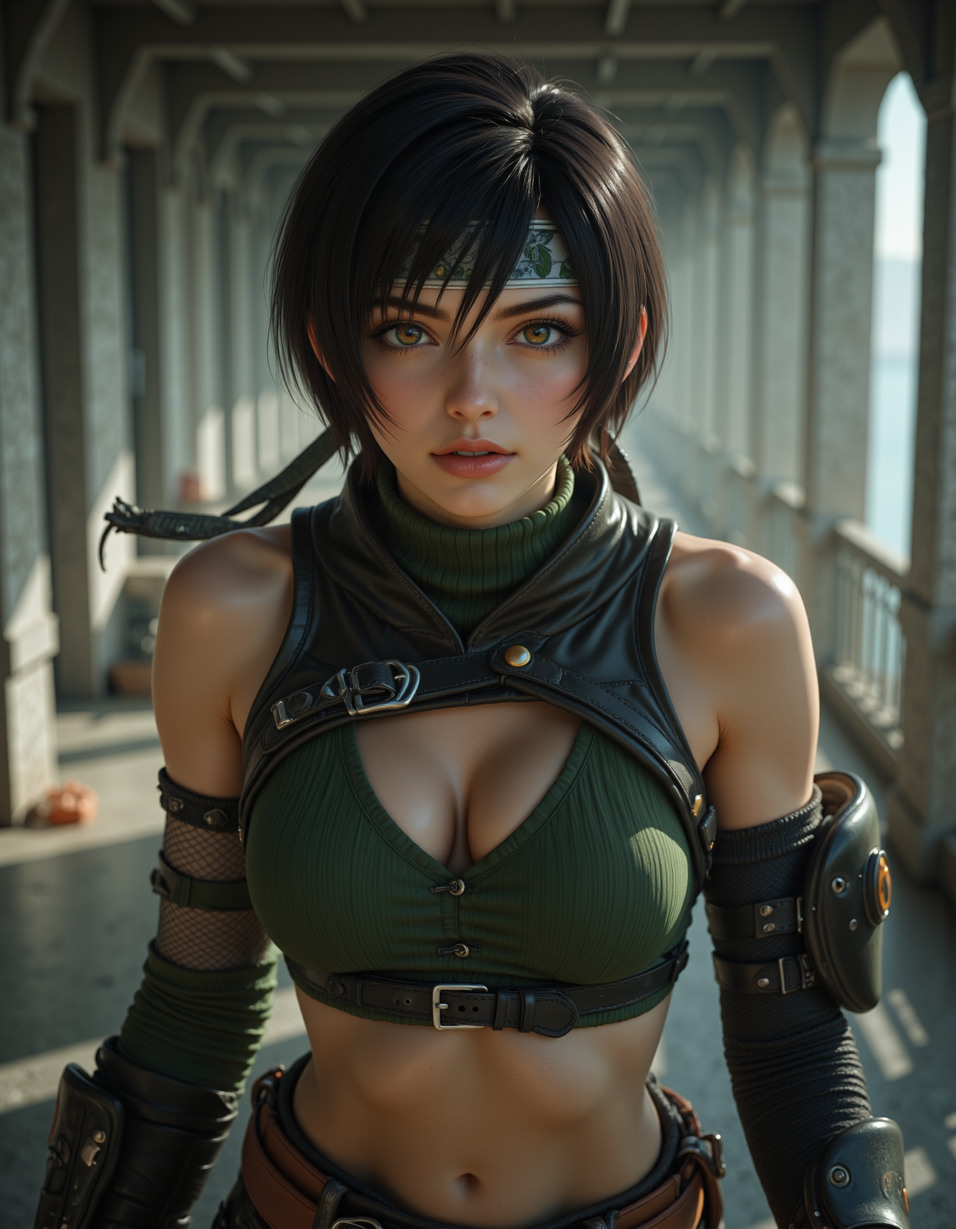 - 描述:深绿色短款连帽衫,战术黑色短裤配装备腰带,黑色过膝袜,护膝,忍者凉鞋,左手佩戴护甲手套,短发波波头,顽皮的微笑。