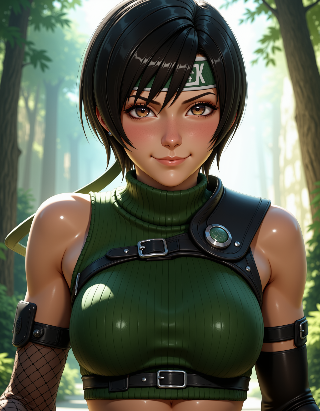 - 描述:无袖绿色高领短上衣,米色短裤(裤门未扣),右臂单侧黑色袖套,露指手套,棕色靴子,装备腰带,短而尖锐的黑色头发,自信的忍者姿态。