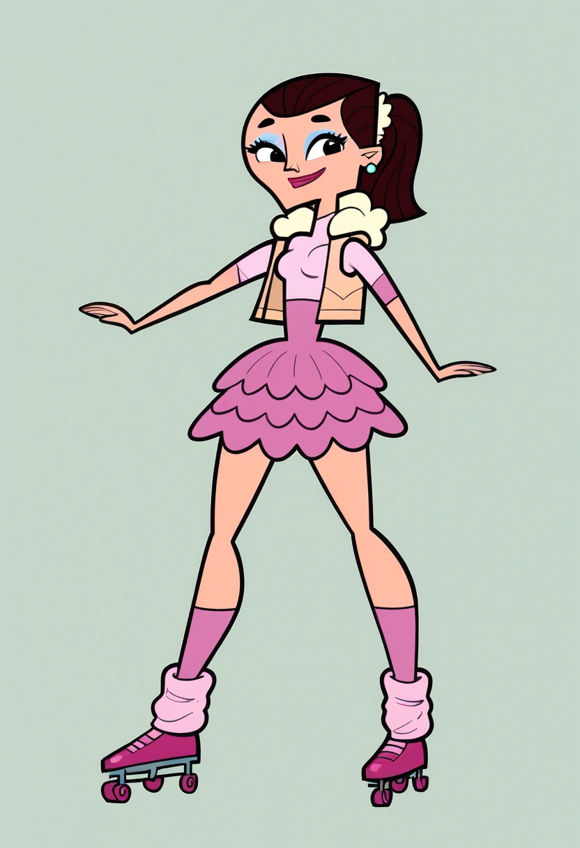 JoseeTDRR, 1girl, pink skating outfit, dark purple layered skirt, long pink leg warmers, dark brown hair, ponytail, black eyes, dark pink lips, lipstick, big lips, light blue eyeshadow, light blue earrings, light brown jacket, pink shoes