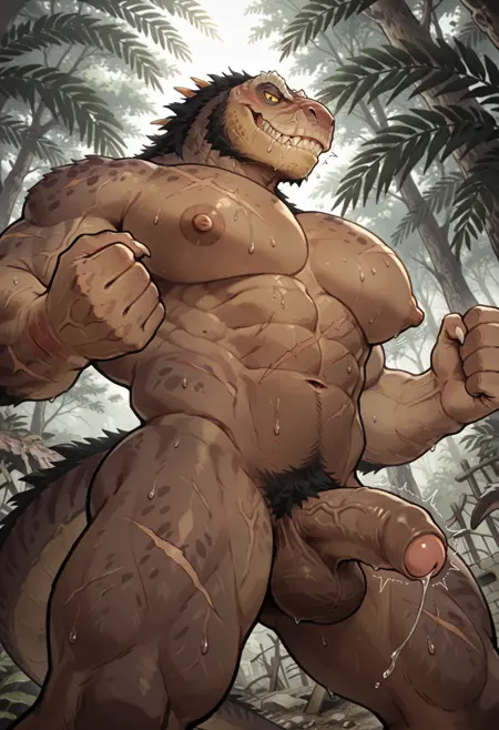 tyrannosaurid, brown skin, tail, scar, black hair, yellow_sclera, claws,