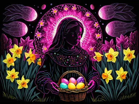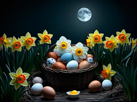 트리거는 **Happy3aster**이며, 봄난초나 바구니에 담긴 알이 나타나지 않으면 _daffodils_와 _eggs in basket_를 추가하세요. 폰이는 봄난초를 모르므로, 봄난초가 보이지 않는다면 _yellow flowers_를 시도해보세요.