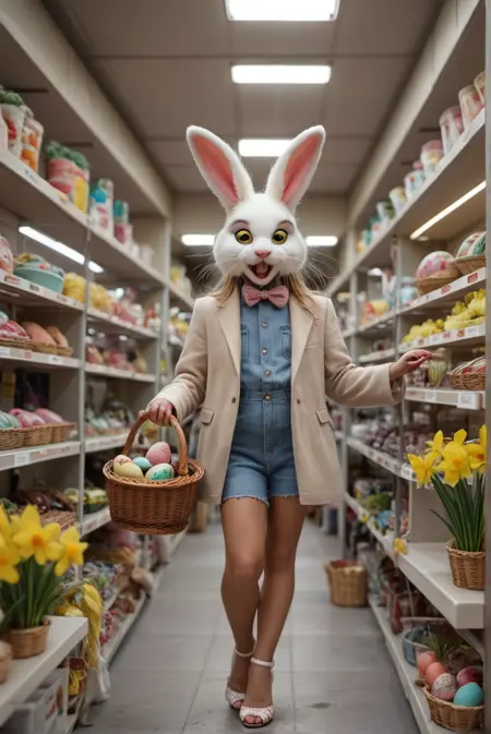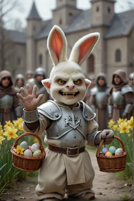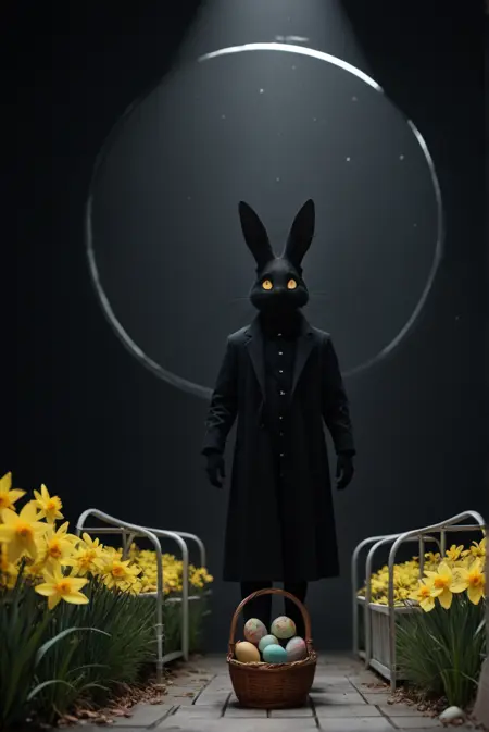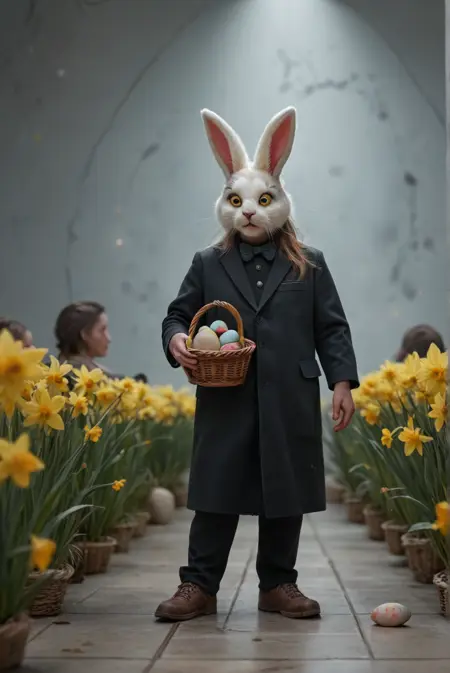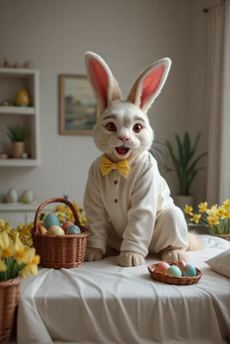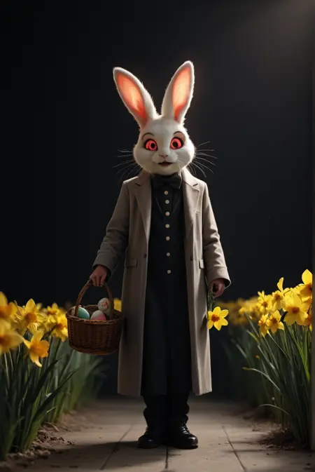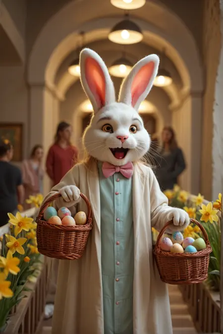 复活节快乐!(多彩或彩绘)篮子里的彩蛋、一束束水仙花,它也很擅长给角色加上兔耳朵、兔脸,甚至整个兔头。此外,还有拟人化的兔子供你尽情欣赏!