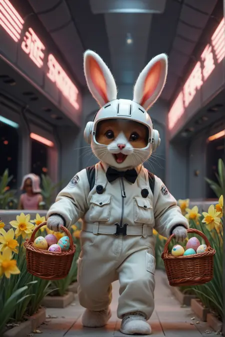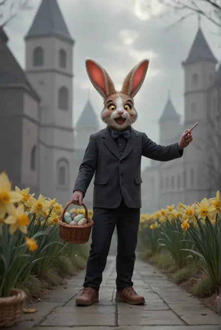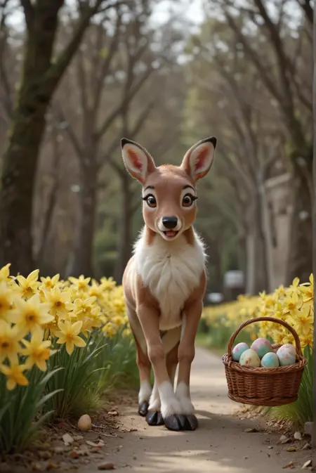 触发词是 Happy3aster,如果未显示水仙花和篮子里的彩蛋,请添加 daffodilseggs in basket。小马不认识水仙花,如果缺少水仙花,请尝试使用 yellow flowers