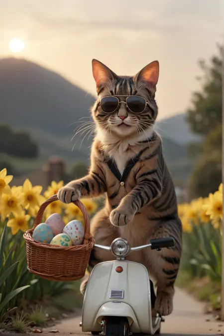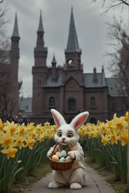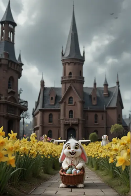 触发词是 Happy3aster,如果未显示水仙花和篮子里的彩蛋,请添加 daffodils 和 eggs in basket。小马不认识水仙花,如果缺少水仙花,请尝试使用 yellow flowers。