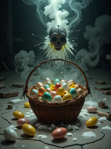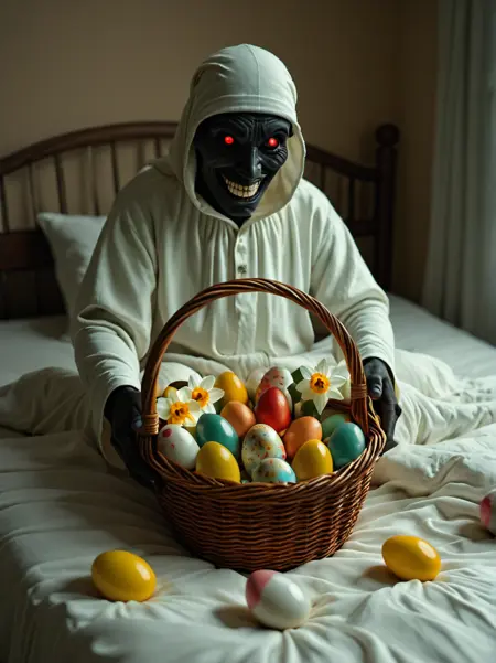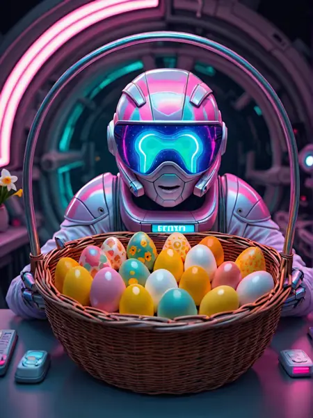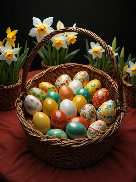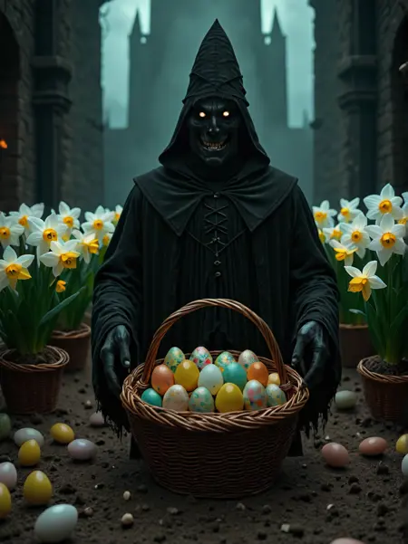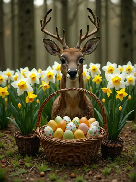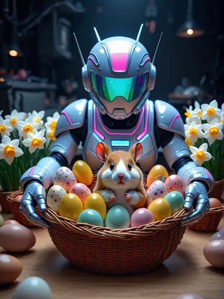 트리거는 **Happy3aster**이며, 봄난초나 바구니에 담긴 알이 나타나지 않으면 _daffodils_와 _eggs in basket_를 추가하세요. 폰이는 봄난초를 모르므로, 봄난초가 보이지 않는다면 _yellow flowers_를 시도해보세요.