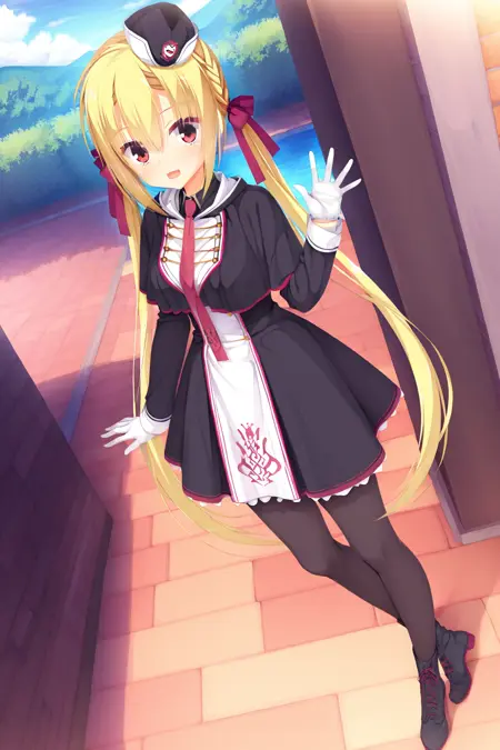 black dress, uniform, short dress, red bow, white gloves, red necktie, black pantyhose, black footwear, cross-laced footwear, mini hat, black headwear