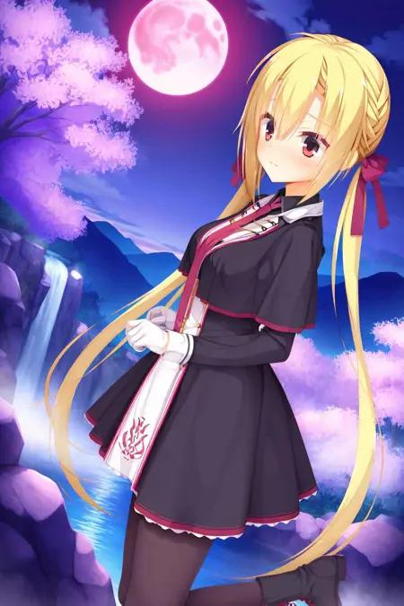 1girl,solo,arihara nanami, riddle joker,blonde hair, long hair, twintails, hair between eyes, braid, hair bow, very long hair, red eyes, low twintails, straight hair, hair ribbon, red ribbon