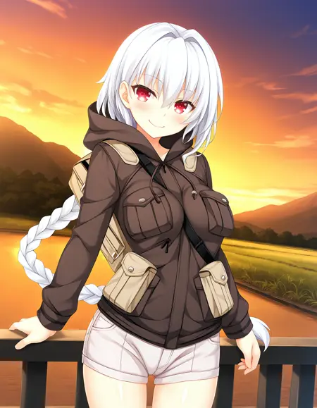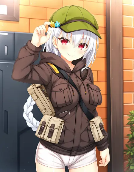 outfit03、ジャケット、濃い茶色ジャケット、フード付きジャケット、フーディー、ジャケットのポケット、バッグ、明るい茶色バッグ、ショルダーバッグ、バッグのストラップが胸の間を通る、ショートパンツ、白ショートパンツ、極短パンツ、{キャップ、緑のキャップ、キャップのアクセサリー|}