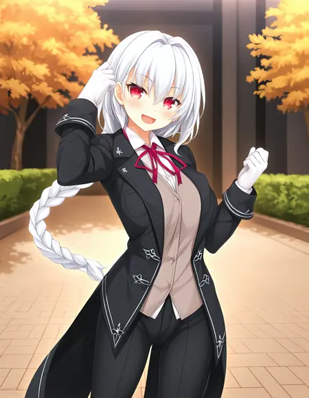 outfit02、ジャケット、黒ジャケット、スワロウテイルジャケット、ロングスリーブ、シャツ、白シャツ、カラーシャツ、ループタイ、赤いループタイ、ベスト、膨らんだベスト、ズボン、黒ズボン、手袋、白手袋、