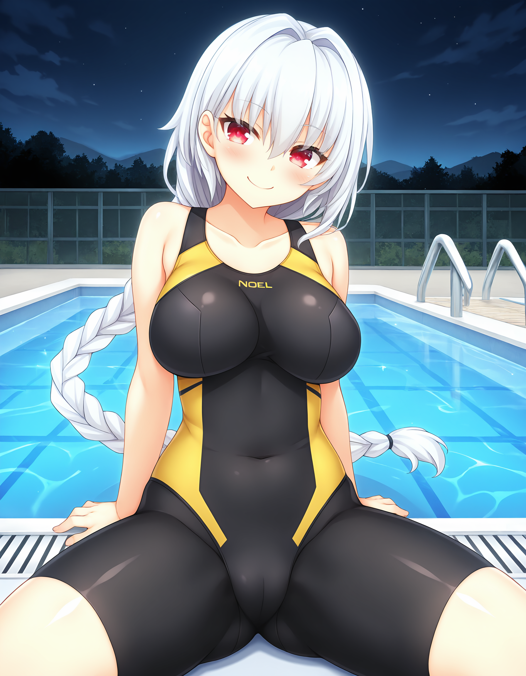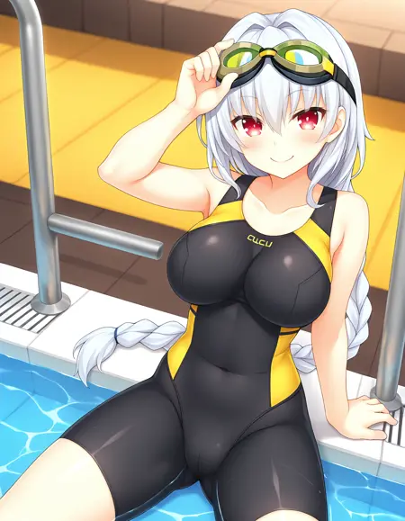 outfit04、水着、競技用水着、ハーフパンツ型水着、陰部をカバー、太ももをカバー、ワンピース水着、黄色のテープ付き水着、ぴったりフィット、黒水着、ノースリーブ、鎖骨、{ゴーグル、水泳用ゴーグル、頭につけたゴーグル|}