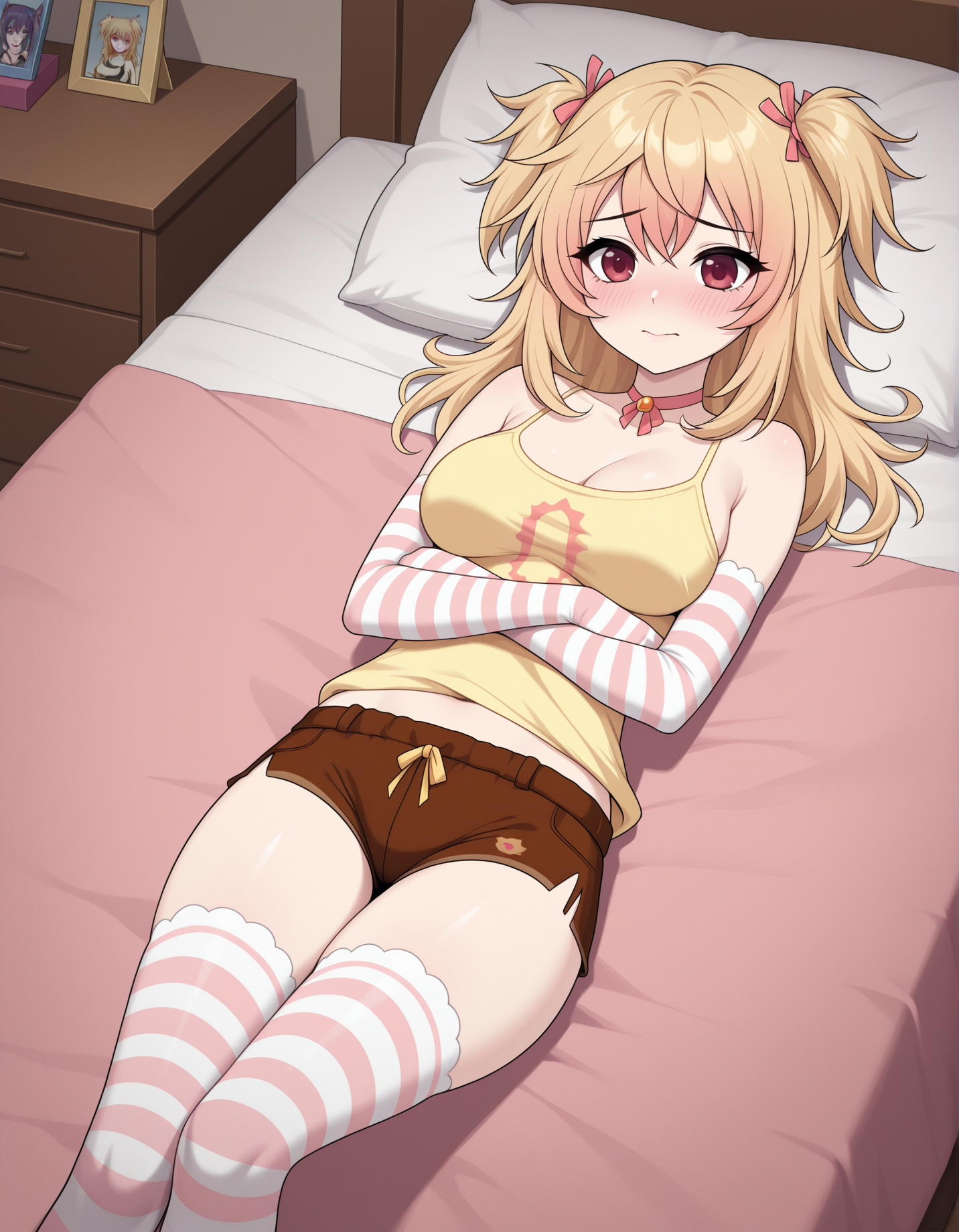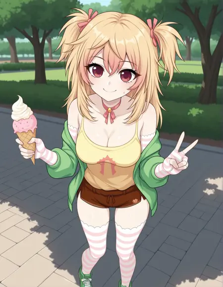 mioillu, striped thighhighs, brown shorts, green jacket, striped gloves, tank top, choker