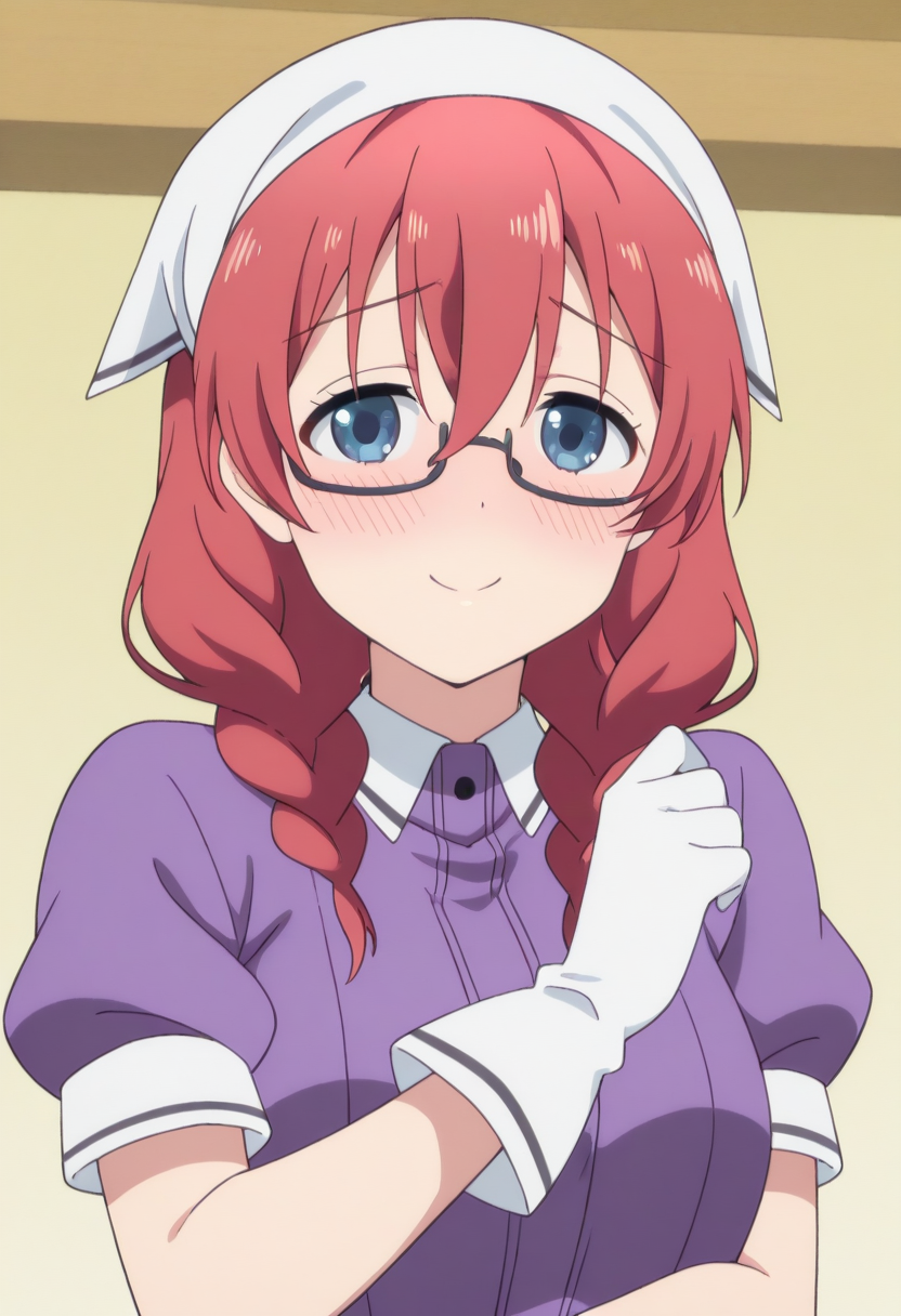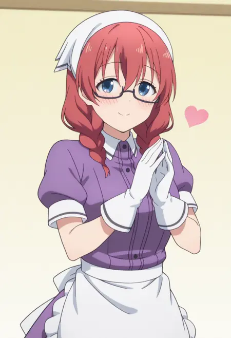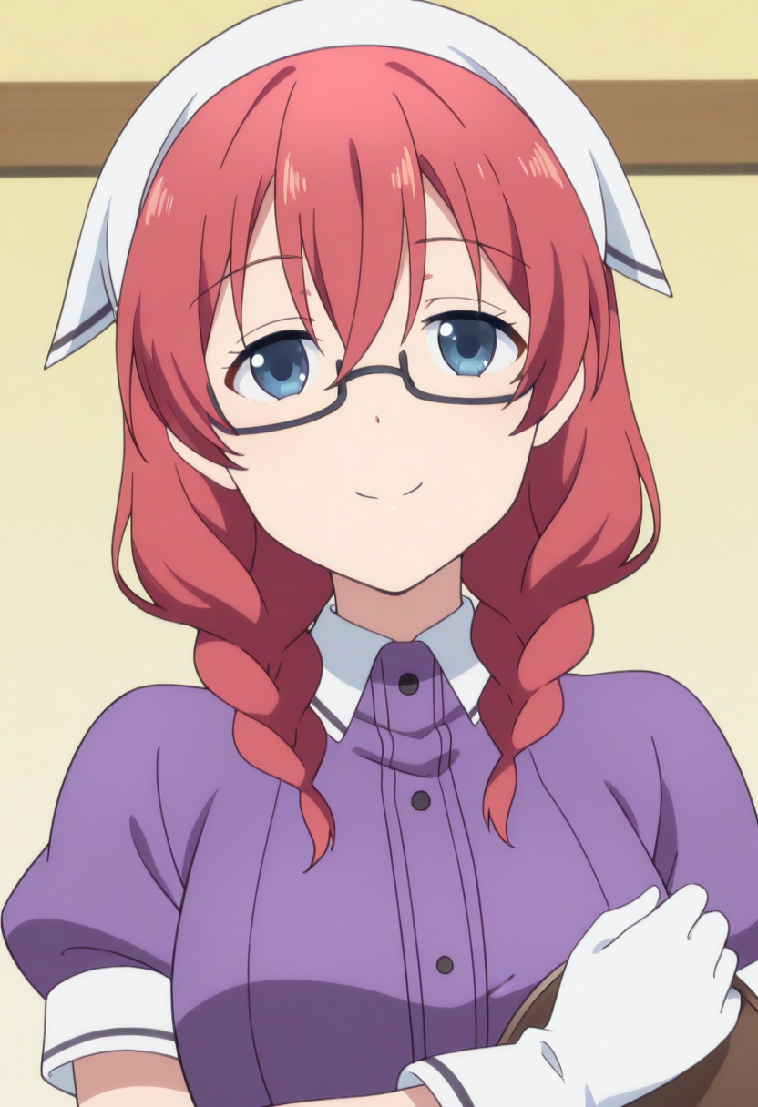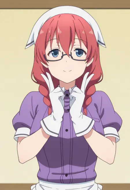 트리거 = zzmiuamanozz, 태그 = 빨간 머리, 땋은 머리, 쌍둥이 땋은 머리, 1소녀, 단독, 파란 눈, 미소, 안경, 긴 머리, 시청자 바라보기, 앞머리, 셔츠, 반프레임 안경, 언더림 안경, 눈 사이 머리카락, 짧은 소매, 머리수건, 장갑, 흰 장갑, 웨이트리스,