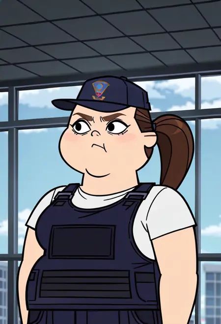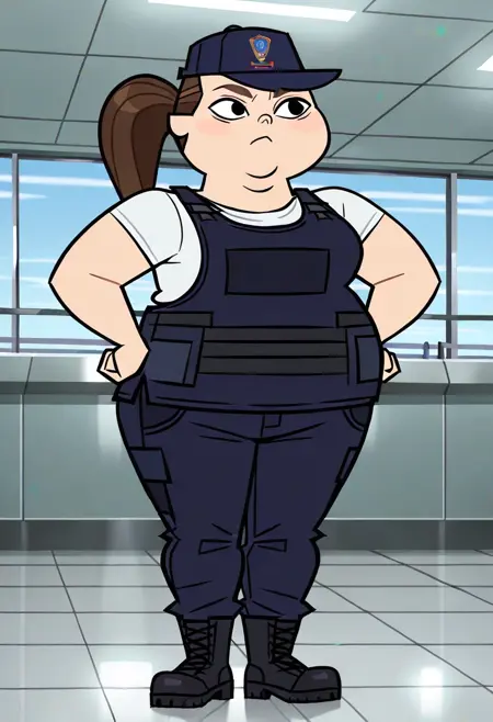 MacarthurTDRR, 1girl, tall overweight, light skin, curvy bod, black eyes, brown hair, ponytail, large chin, white t-shirt, navy-blue overalls with black trimmings, dark blue denim cap, black boots with laces, fat, chubby,