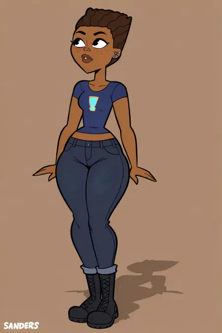 SandersTDRR, 1girl, dark skinned female, short spiky brown hair, gray earrings, dark blue short-sleeve shirt, dark blue pants, black boots, freckles, lips, big lips, sanders (tdi),