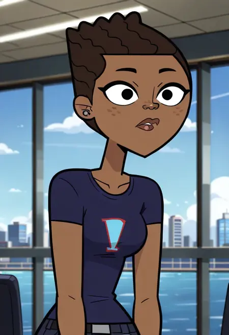 SandersTDRR, 1girl, dark skinned female, short spiky brown hair, gray earrings, dark blue short-sleeve shirt, dark blue pants, black boots, freckles, lips, big lips,