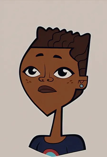 SandersTDRR, 1girl, dark skinned female, short spiky brown hair, gray earrings, dark blue short-sleeve shirt, dark blue pants, black boots, freckles, lips, big lips,