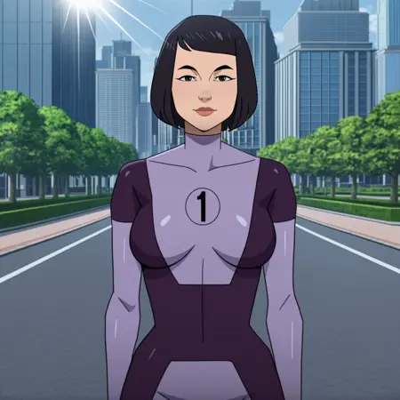 Trigger words: dupl1k3t3, black hair, black eyes, lips, purple bodysuit, number_one