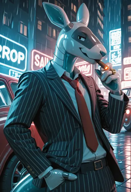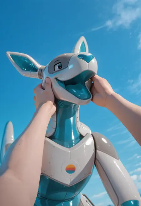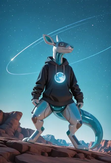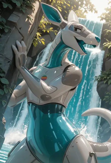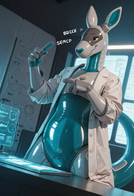 b0ndi_bra3burned, kangaroo, robot, synth (vader-san), translucent body, inflatable, android, solo, 1boy, tail, no humans, furry, shiny, android, black eyes, handle