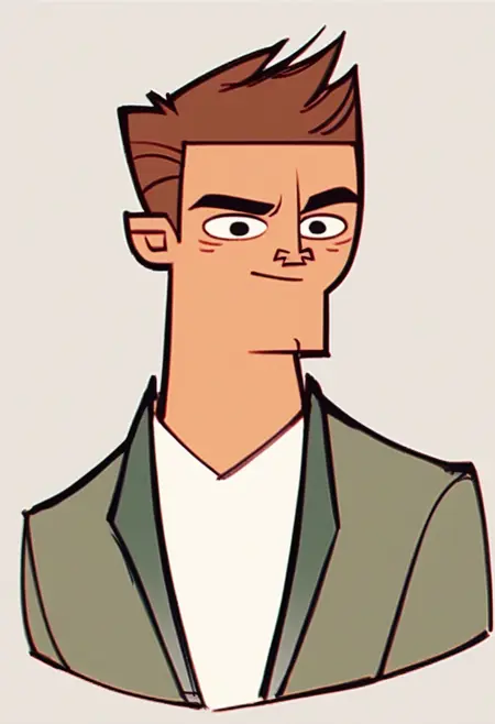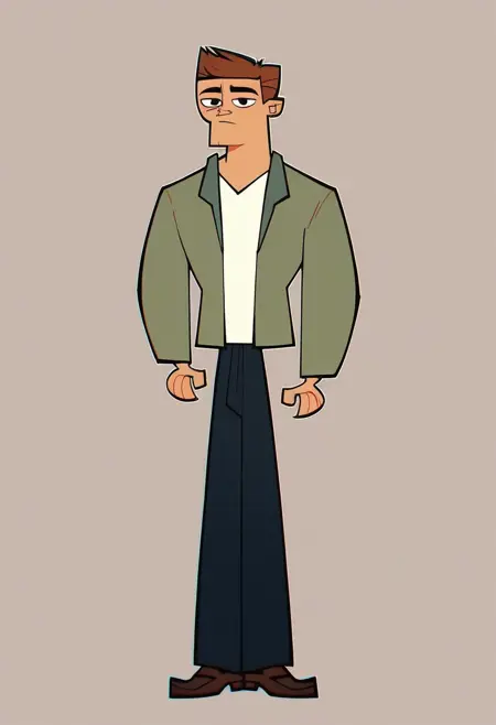 DonTDRR, 1boy, short brown hair, light desaturated green jacket, white shirt, dark blue pants, brown shoes, black eyes,