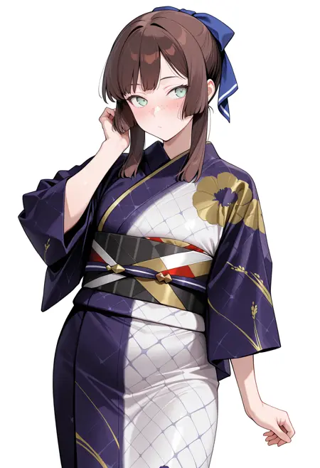- mogayuk, blue ribbon, hair bow, two-tone kimono, indigo kimono, white kimono, print kimono, yukata, black sash,