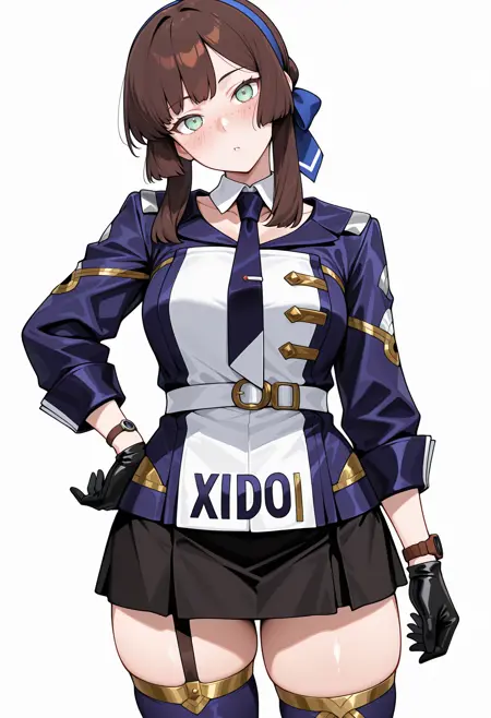 - mgdrkai, blue hairband, uniform, detached collar, blue jacket, necktie, gold trim, black belt, long sleeves, white gloves, wristwatch, black skirt, french flag print, single garter strap, indigo thighhighs,