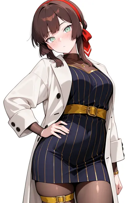 - mogaval, red hairband, red ribbon, hair ribbon, necklace, dark blue dress, pinstripe pattern, yellow belt, white coat, open coat, bodystocking, thigh strap, black footwear, high heels,