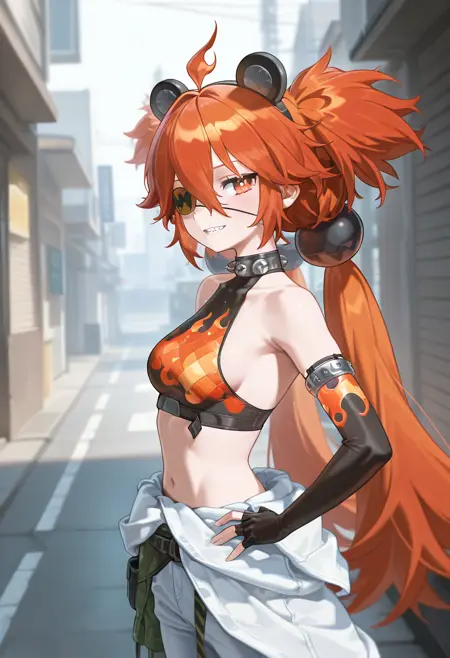 衣装のタグ: 肩出し, 黒い手袋, 腹出し, 指なし手袋, クロップトップ, 黒いシャツ, 袖なしシャツ, 黒いチョーカー, サイドブーブ, ハルタネック, 白いジャケット, アームレット, 白いパンツ, 黒いカラー, アームストラップ, スパイク付きカラー, ジャギーな線, 片肘手袋, メタルカラー, 腰に巻いたジャケット, フレームプリント,