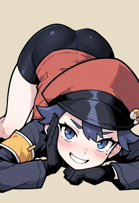 Key word is rangerex and for her default look use: short hair, hair between eyes, mole under eye, blue eyes, blue hair, red hat, red jacket, long sleeves, zipper, bike shorts, black gloves, belt, fanny pack, boots,