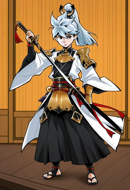 swordmaster, ponytail, facial scar, armor, white coat, black hakama, stirrup legwear, sandals, leader's sword