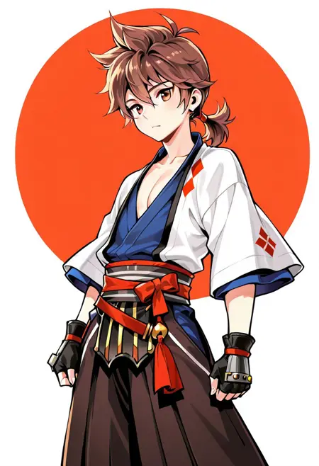 younglord, brown hair, short ponytail, brown eyes, japanese clothes, simple hakama, fingerless gloves, sandals