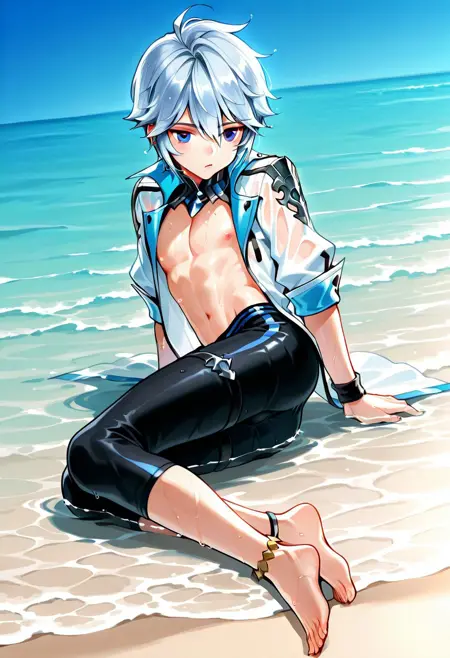 waveslayer, short hair, white jacket, open clothes, black leggings, thigh armor, anklet, barefoot, water sword