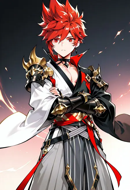 greatgeneral, red hair, spiked hair, red eyes, choker, asymmetrical coat, grey hakama, black gauntlets, sandals