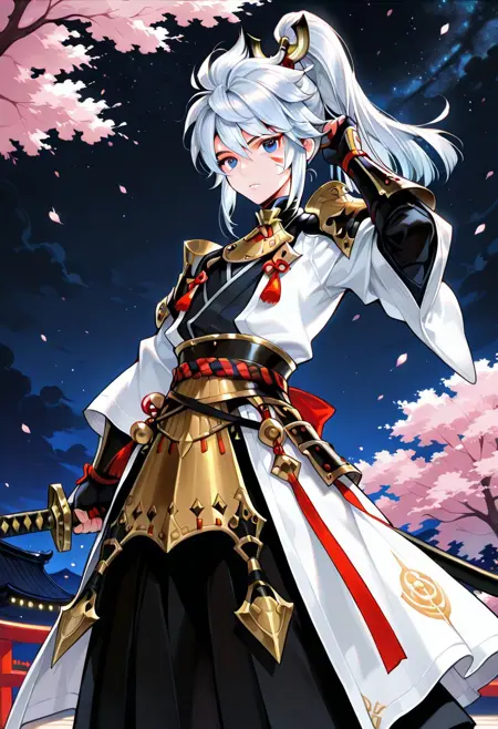 swordmaster, ponytail, facial scar, armor, white coat, black hakama, stirrup legwear, sandals, leader's sword