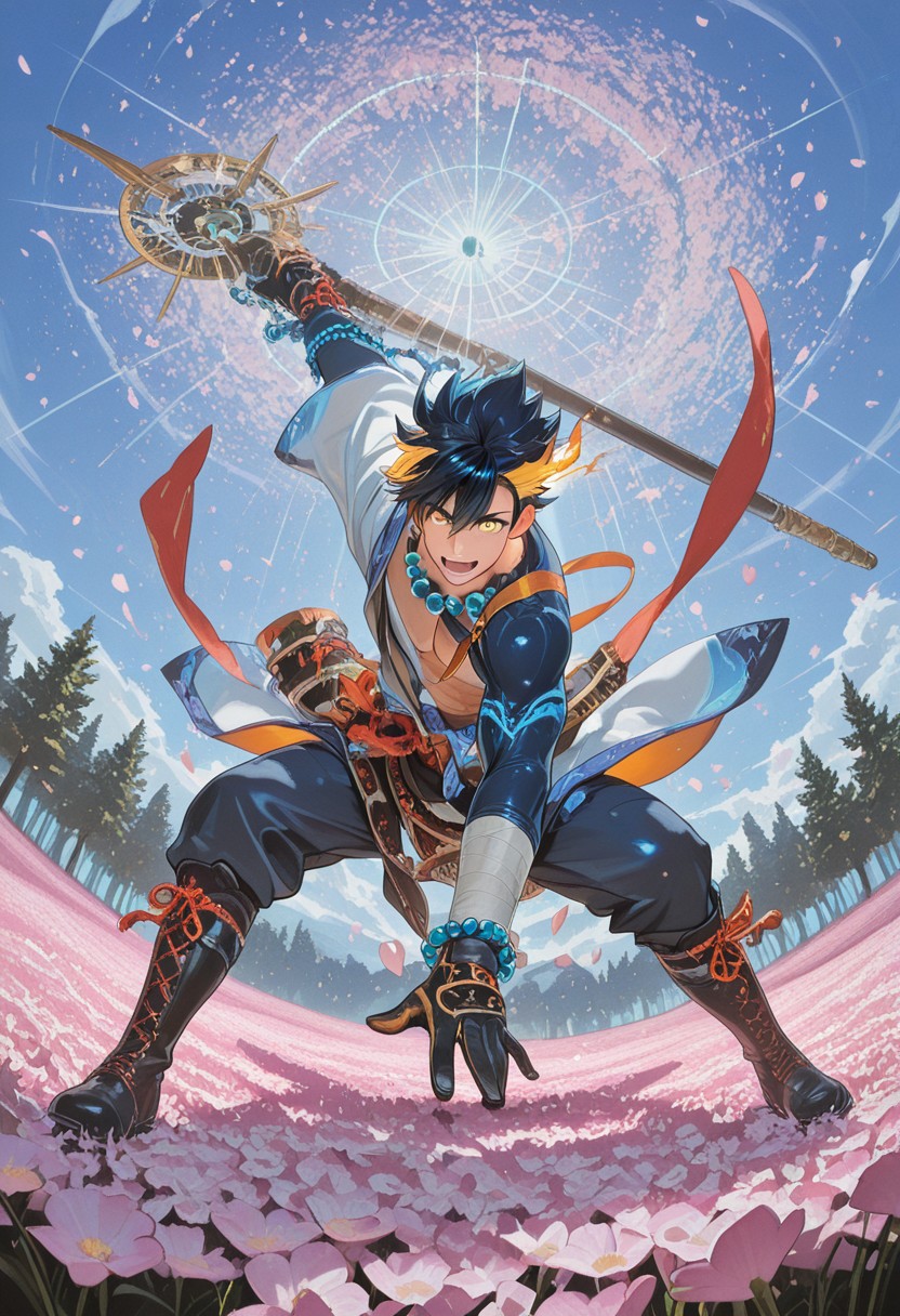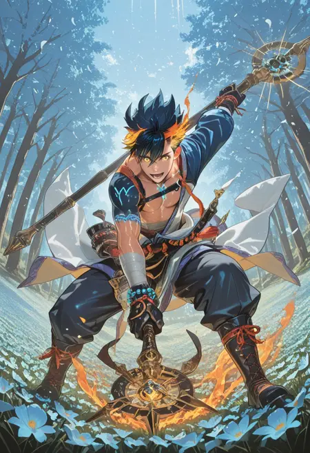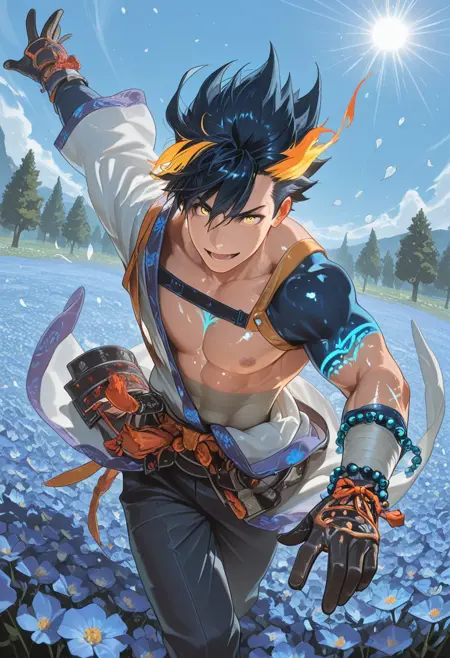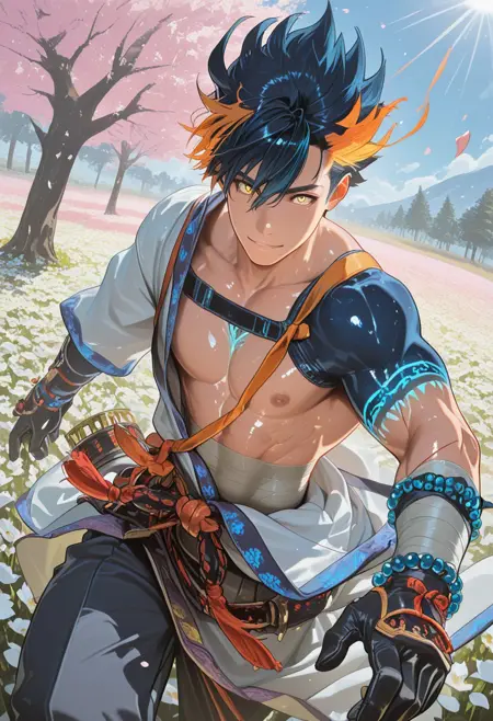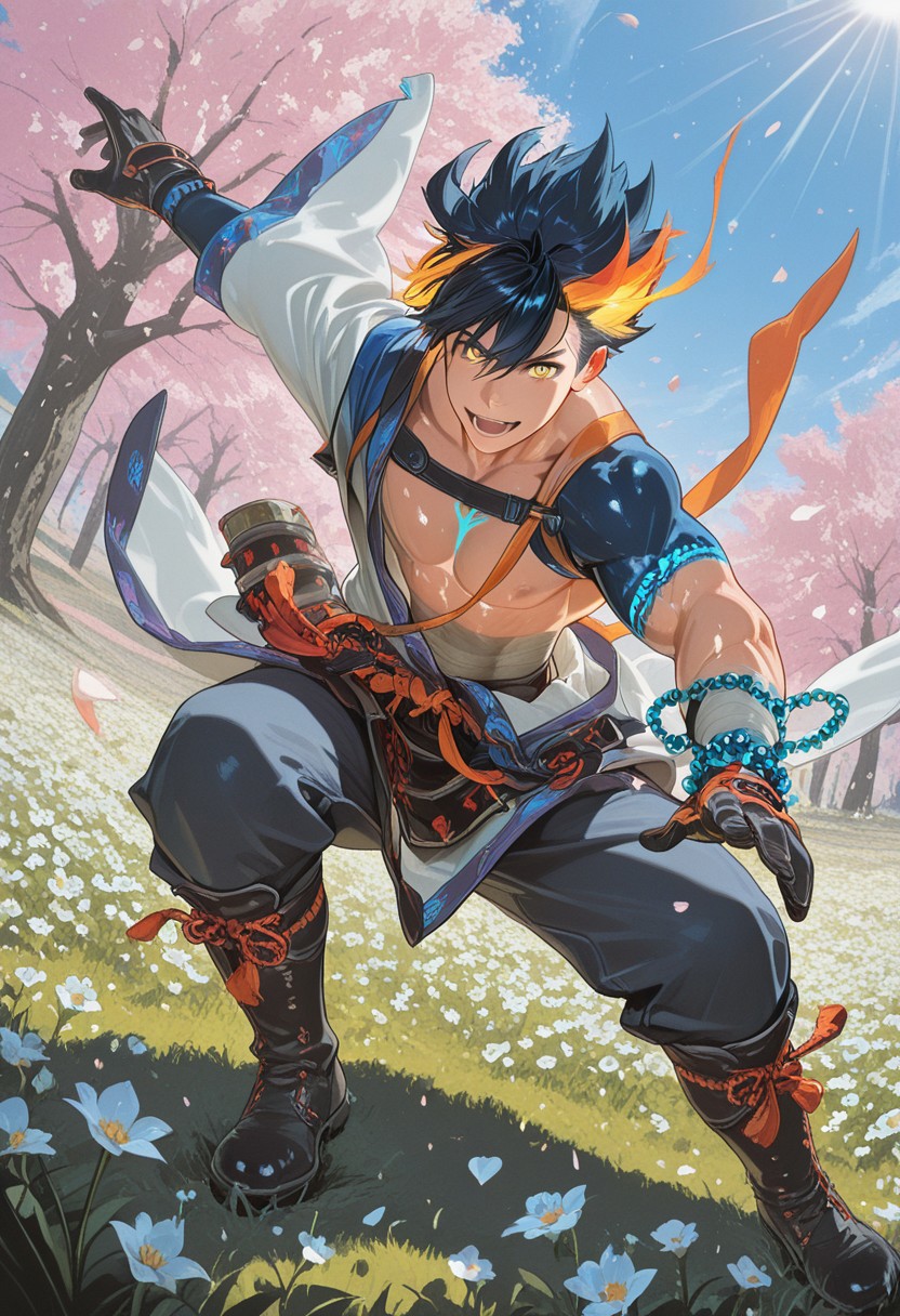 1boy, tagatamezangetsu, mature male, muscle male, multicolored hair, spiked hair, short hair, yellow eyes