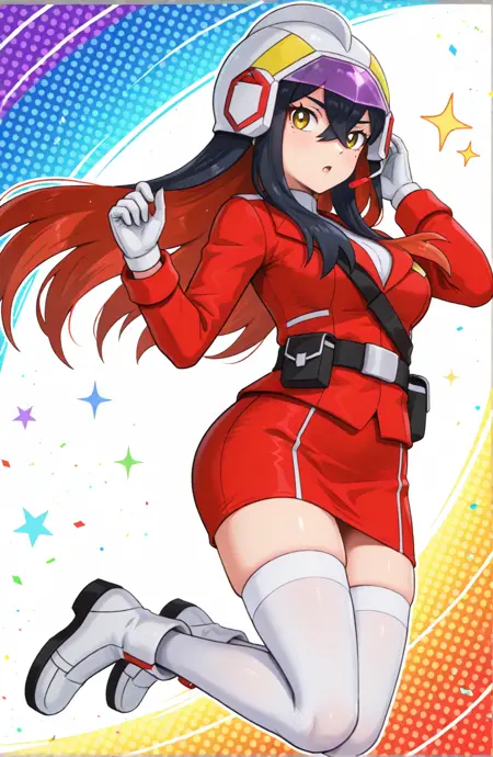 caprosa, blue eyes, white pupils, brown hair, long hair, twintails, bangs, helmet, red jacket, long sleeves, white gloves, black belt, belt pouch, red skirt, zettai ryouiki, white thighhighs