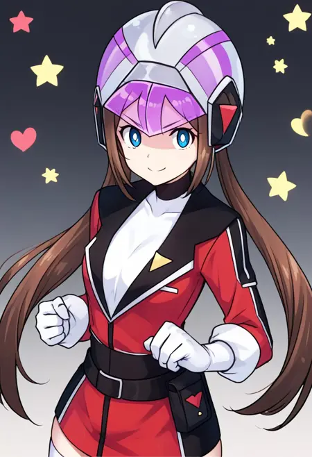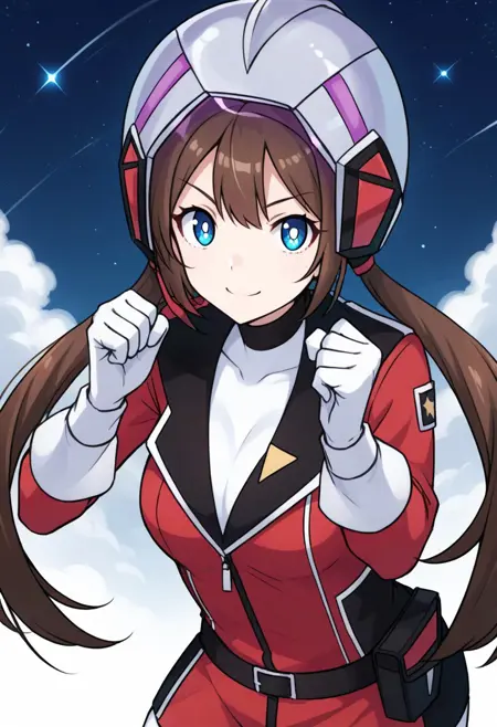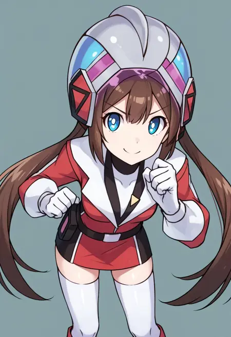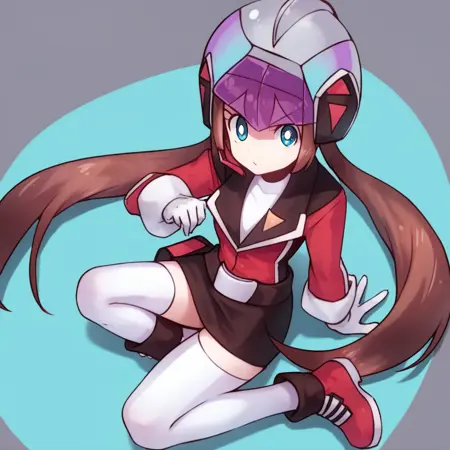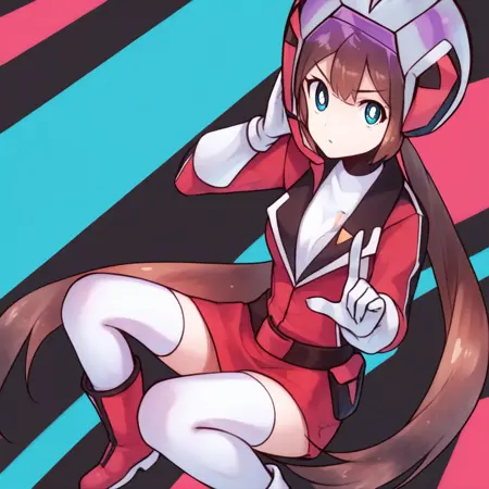 caprosa, blue eyes, white pupils, brown hair, long hair, twintails, double bun, bangs, helmet, red jacket, long sleeves, white gloves, white shirt, black belt, belt pouch, red skirt, zettai ryouiki, white thighhighs