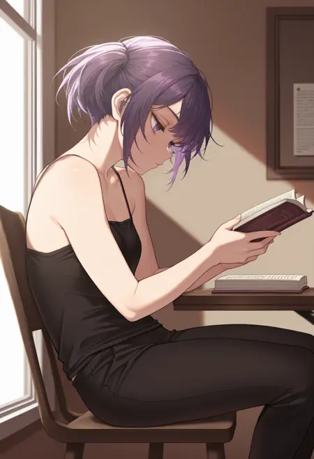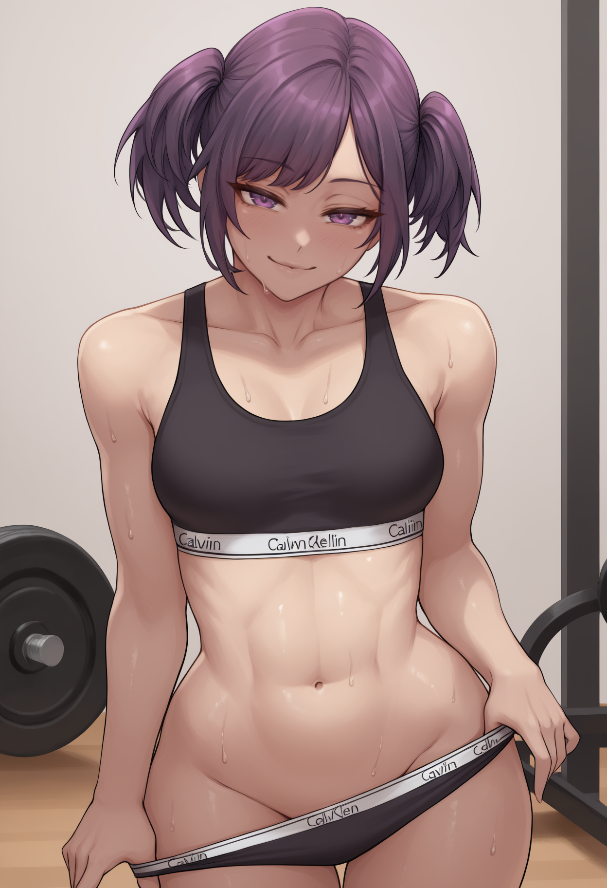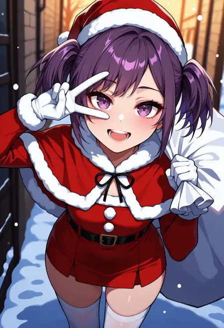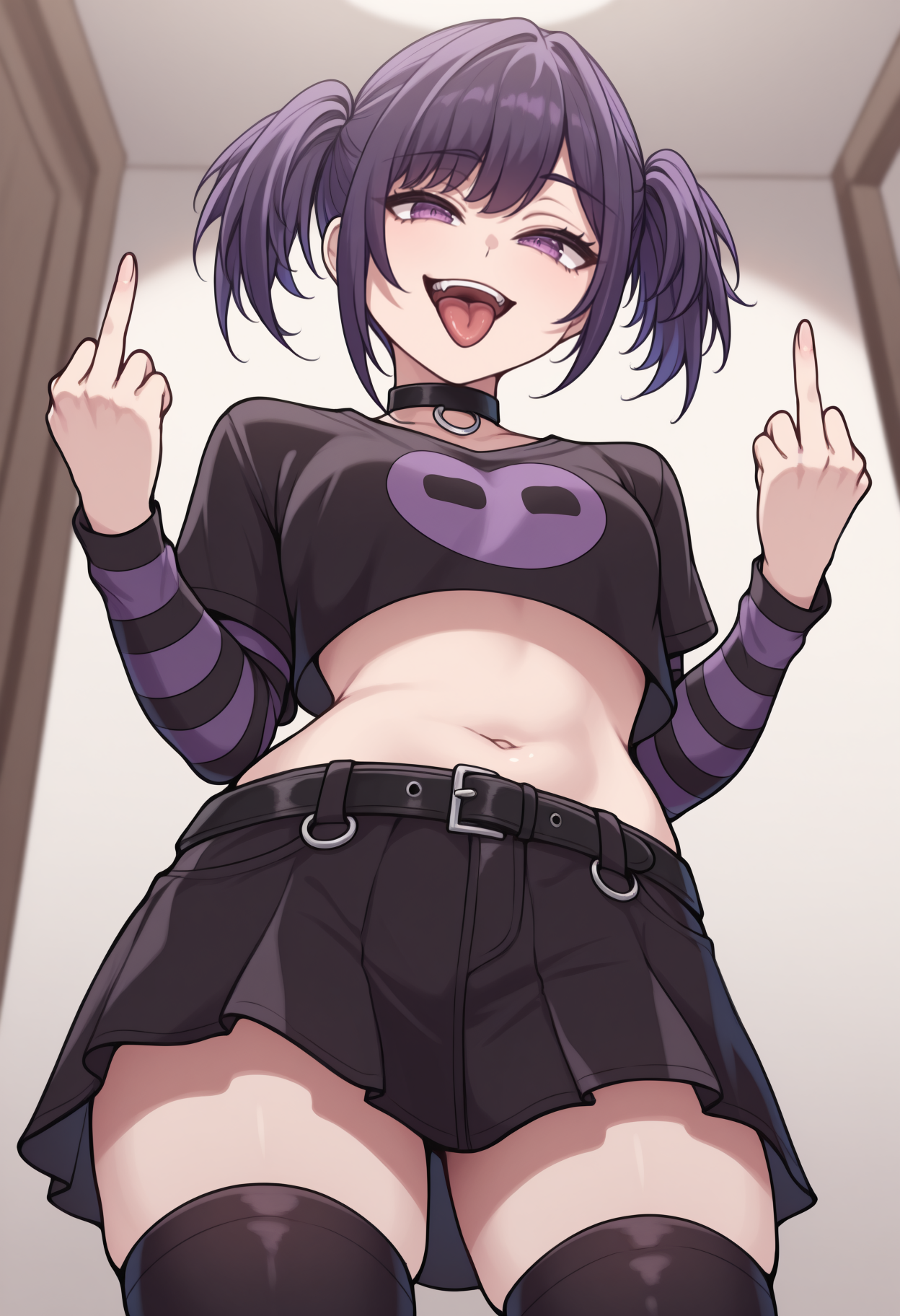트리거 + 외모: s0uma, 단발, 보라색 머리, 짧은 트윈테일, 보라색 눈