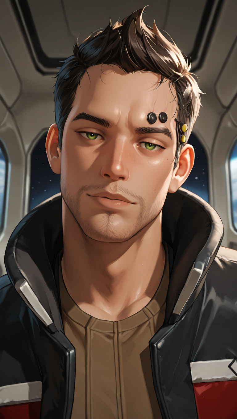 theronshan, 1boy, mature male, brown hair, very short hair, olive green eyes, dark skin, flat nose