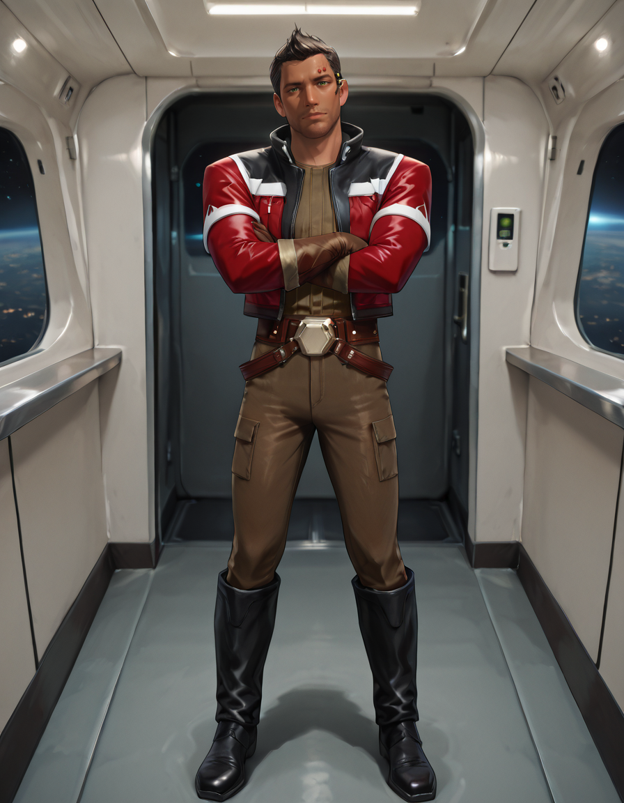 red jacket, brown shirt, brown gloves, belt, brown pants, black boots