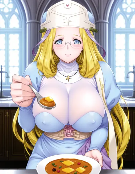 멜파, 1소녀, 솔로, 긴 금발 머리, 파란 눈, 안경, 큰 가슴,
